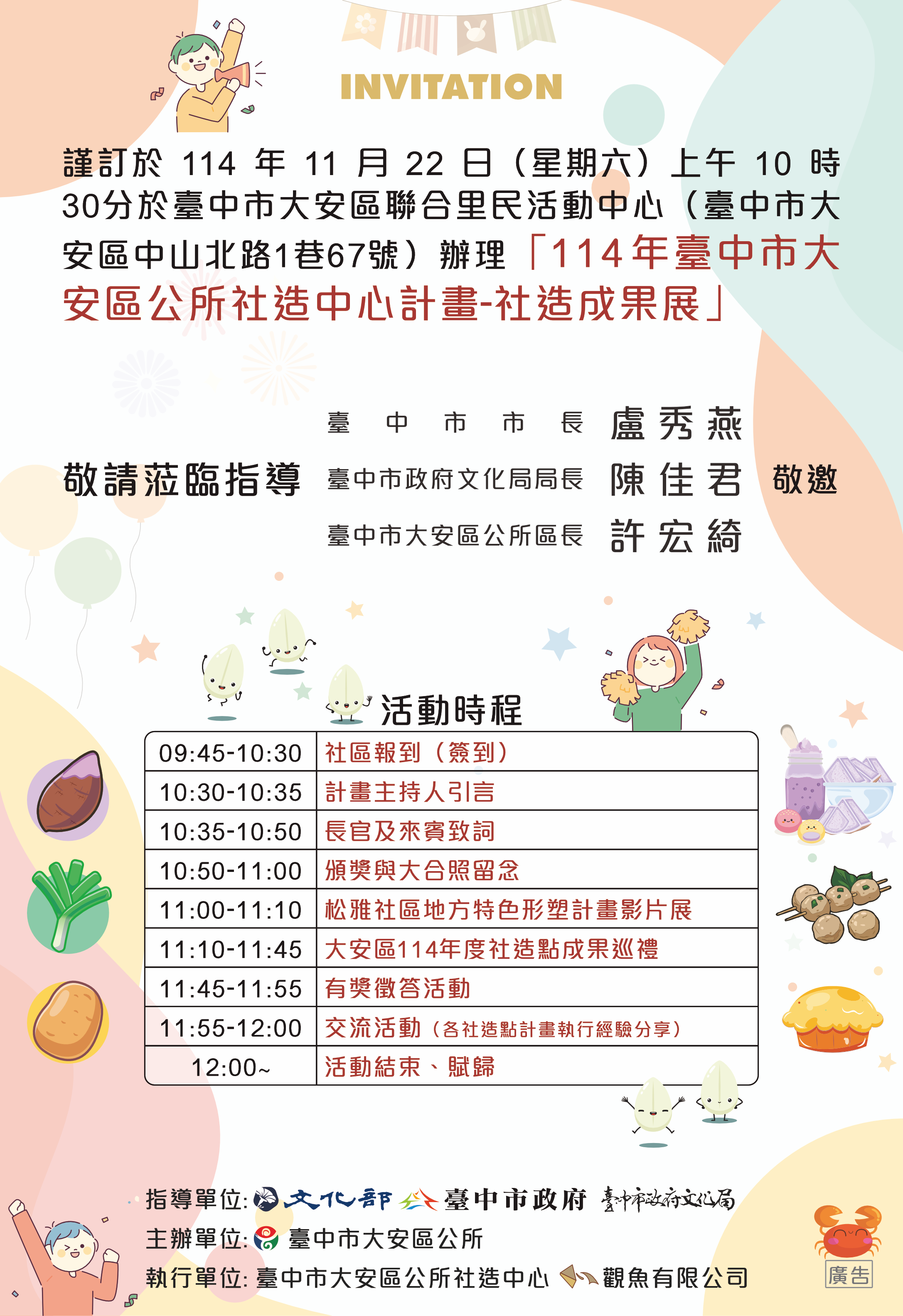 114年臺中市大安區公所社造中心計畫-社造成果展 (一) 辦理時間:114年11月22日(星期六)上午10:30~12:00。(二) 辦理地點:臺中市大安區聯合里民活動中心(臺中市大安區中山北路1巷67號)