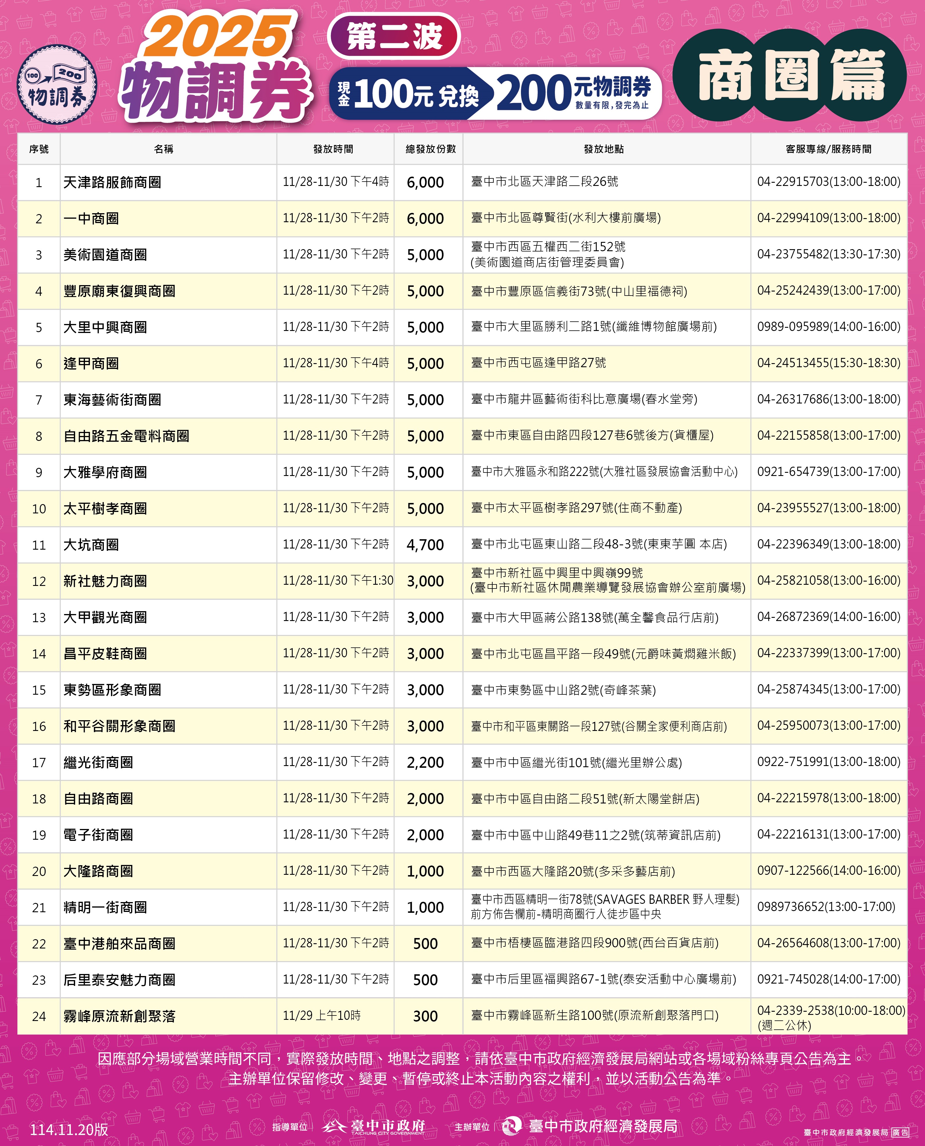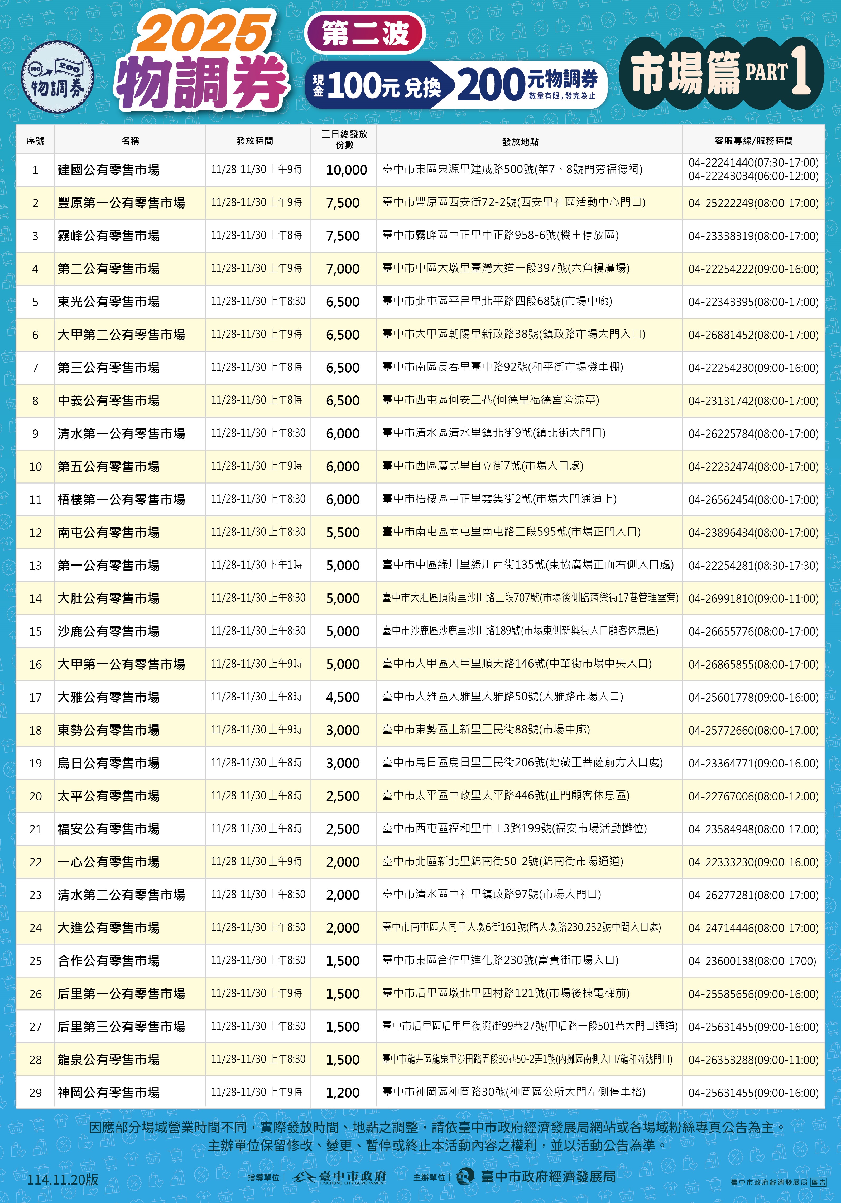 (三)發放地點:29處公有市場、5處民有市場、2處公有委外市場、5處民營市場、20處攤販集中區、23處商圈,以及「霧峰原流新創聚落」與「臺中市產業故事館發展協會」23個所屬會員店家,共108處場域。
