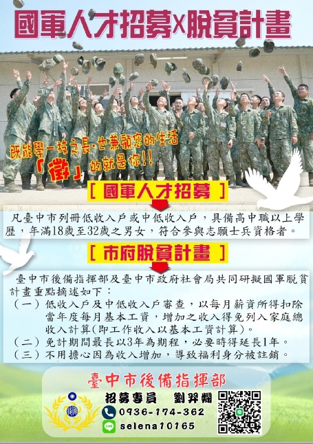 轉知社會局與臺中市後備指揮部合作辦理「臺中市後備指揮部人才招募結合脫貧計畫」之廣告文宣1份