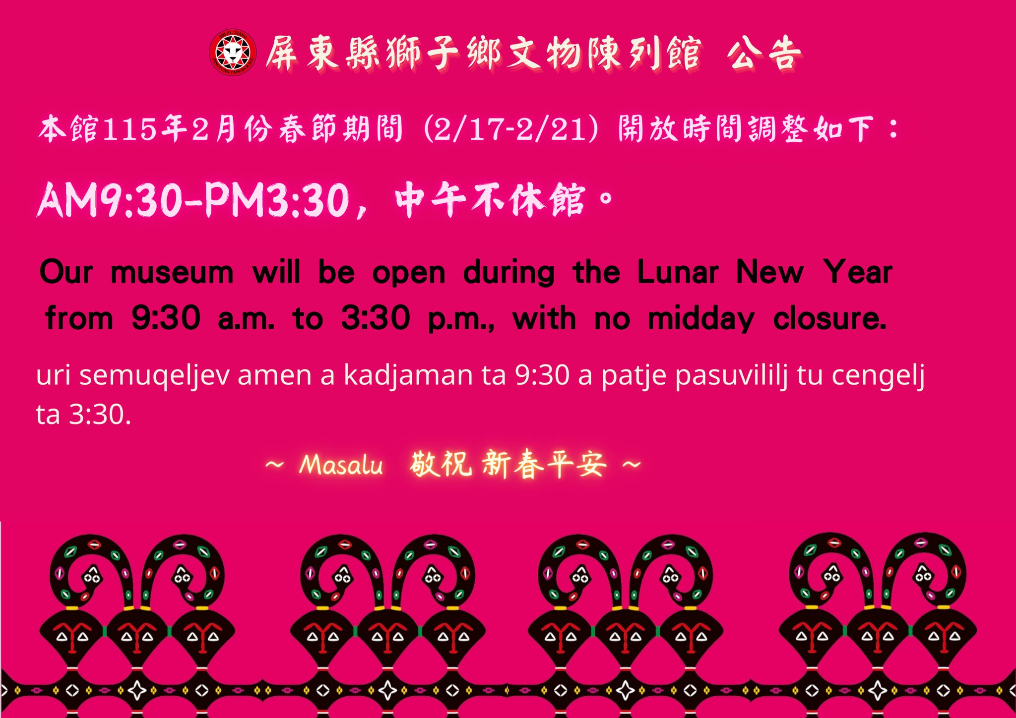 有關本所辦理「Ki cacepeliw 從海那邊.歡迎回家—瑞典國家世界文化博物館典藏排灣族百年文物重返獅子鄉特展」,春節期間正常開館。
