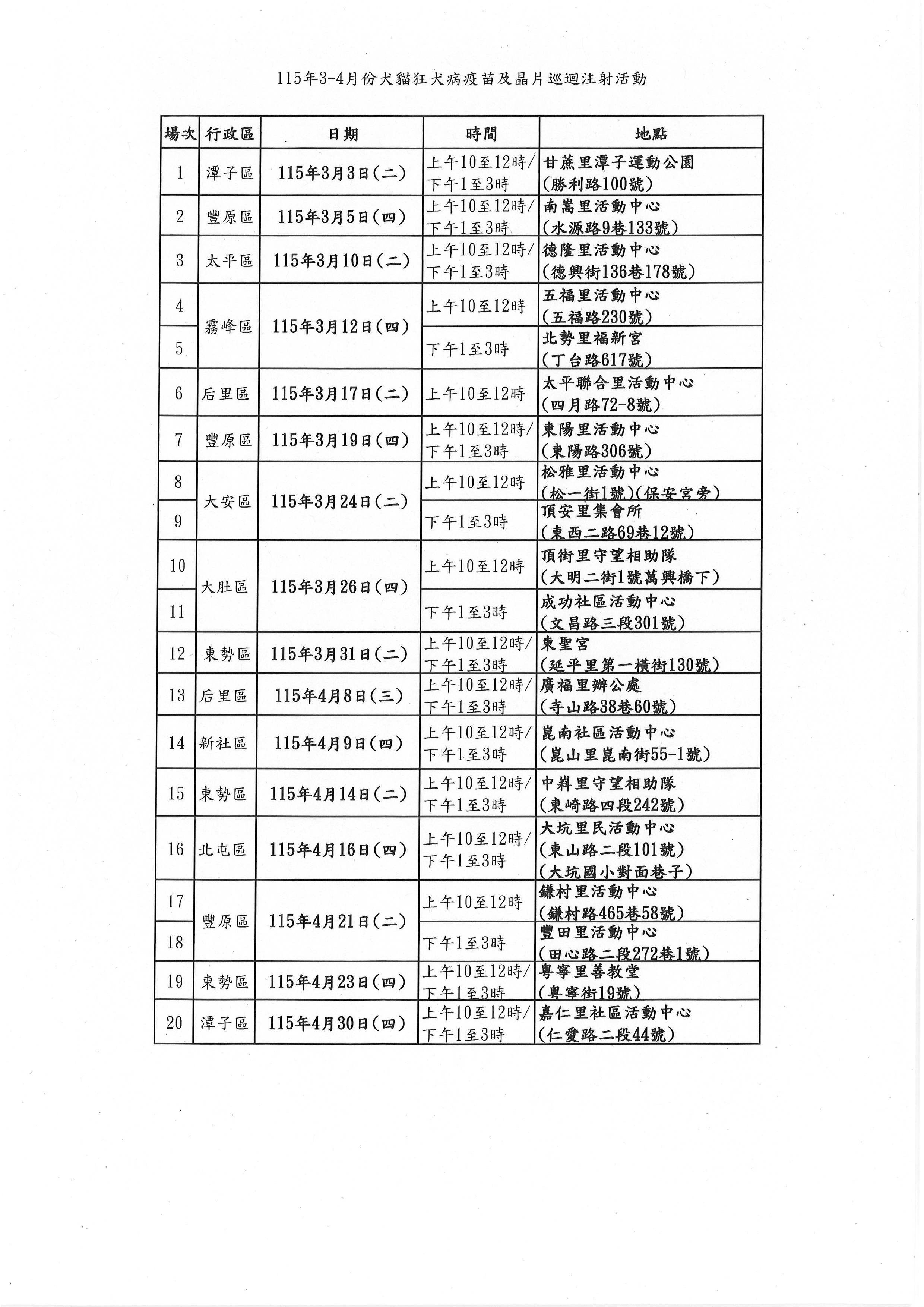 鑑於本市仍有野生鼬獾狂犬病陽性病例發生,臺中市動物保護防疫處115年3-4月份持續辦理犬貓狂犬病疫苗及晶片巡迴注射活動~~~~~轉知鄉親知悉