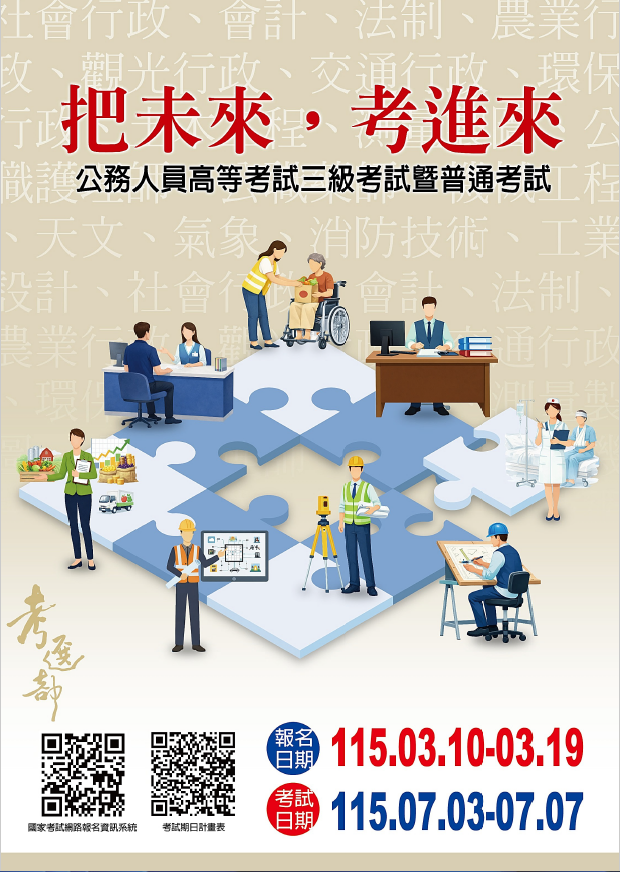 轉知115年公務人員高等考試三級考試暨普通考試定於本(115)年3月10日至19日報名,7月3日至7日舉行考試