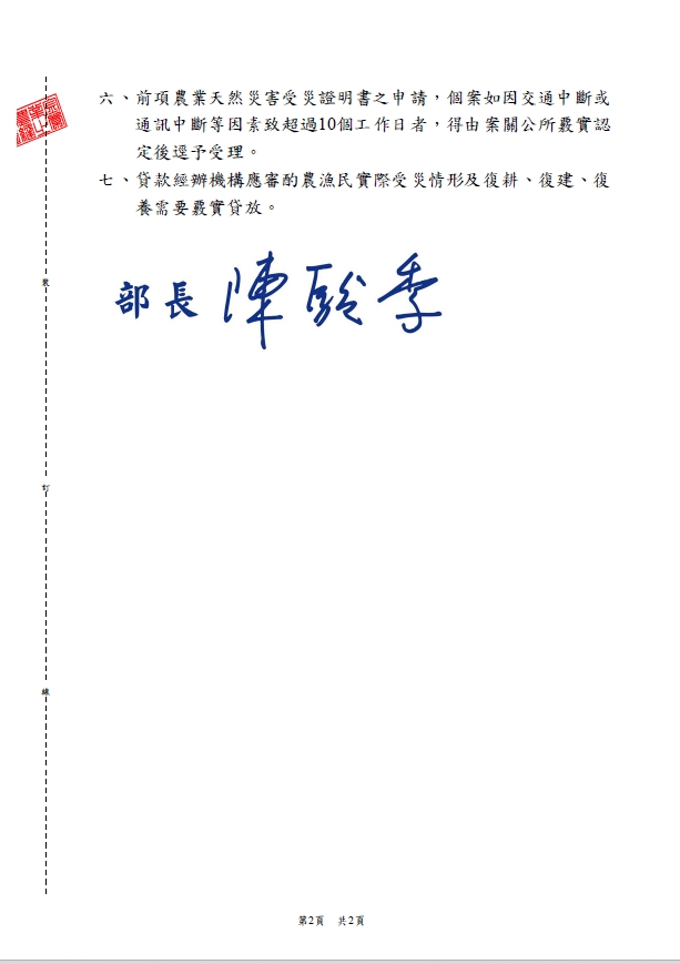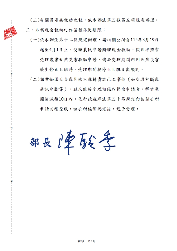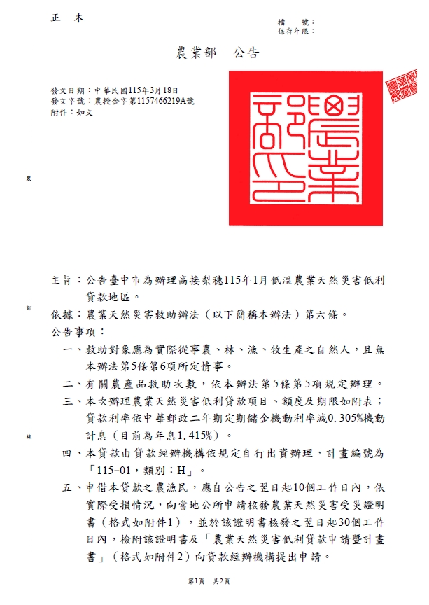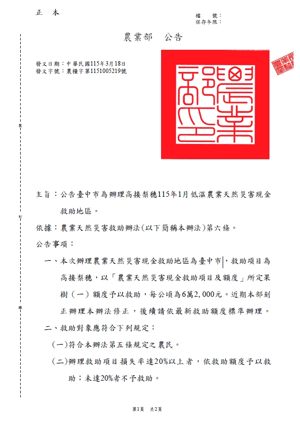 農業部公告臺中市為辦理115年1月低溫農業天然災害現金救助及低利貸款地區。