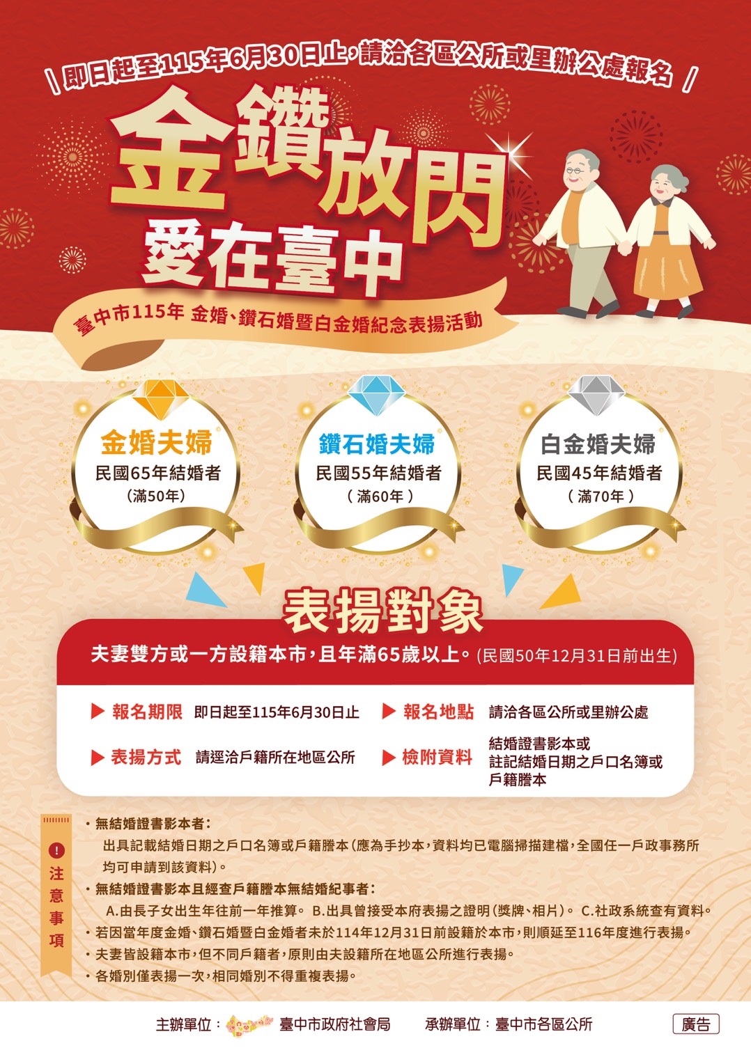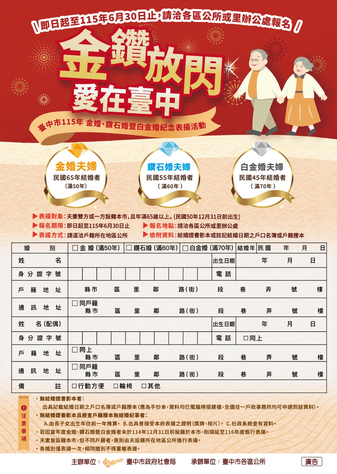 115年金婚、鑽石婚、白金婚紀念表揚活動~即日起開始報名