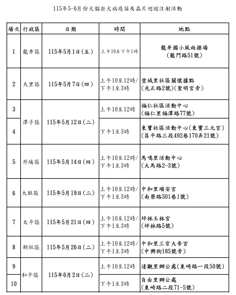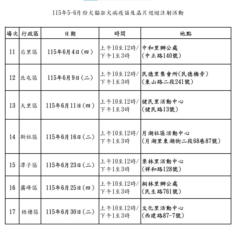 鑑於本市仍有野生鼬獾狂犬病陽性病例發生,臺中市動物保護防疫處115年5-6月份持續辦理犬貓狂犬病疫苗及晶片巡迴注射活動~~~~~轉知鄉親知悉